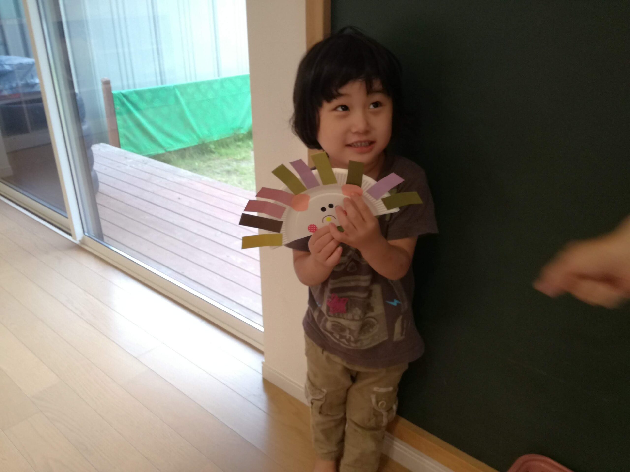 秋らしくハリネズミです。とげは様々な色の色画用紙を両面テープで貼り付けました。