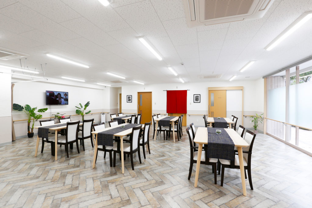 暖かい日差しが差し込む広々とした空間で日中お過ごしていただけます。 こちらで、お食事・生産活動(おしごと)・レクリエーション等を行います。