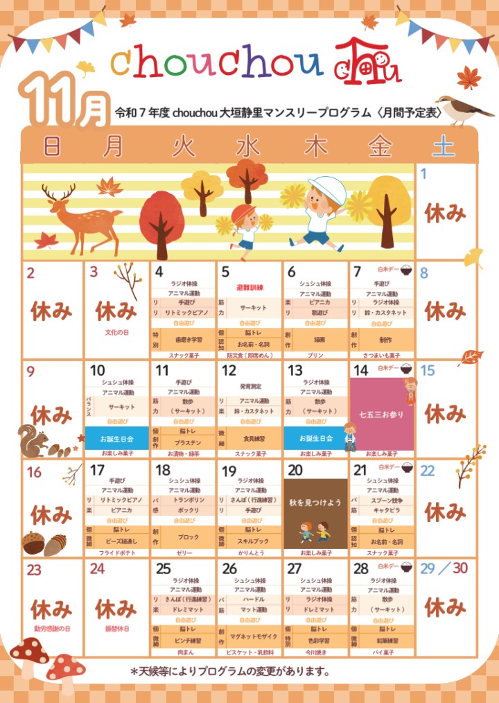 朝晩と肌寒く感じることが多くなってきましたね~🍁 今月はお誕生日会やスポーツを楽しむ会等がありました(*´▽`*) 来月は七五三お参りや秋見つけ♪を予定しています。 他にも多彩なプログラムを準備しております。 chouc […] -