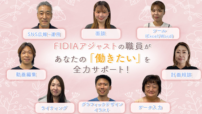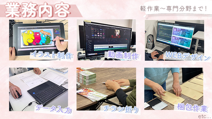 一般的な就労継続支援B型の事業所では、内職のお仕事や軽作業を行う事が多いですが、AsFineアジャストではデータ入力やデザイン、動画編集などIT関連の仕事を学べる環境を整えております。