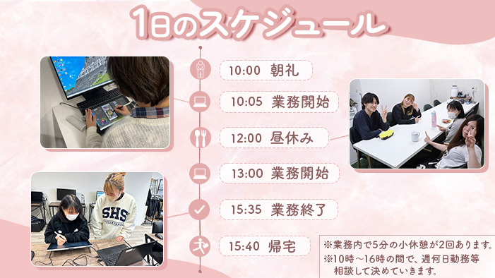 - 午前の業務:プログラミングやイラスト、動画編集、データ入力などの業務を実施。不明点は職員に質問。