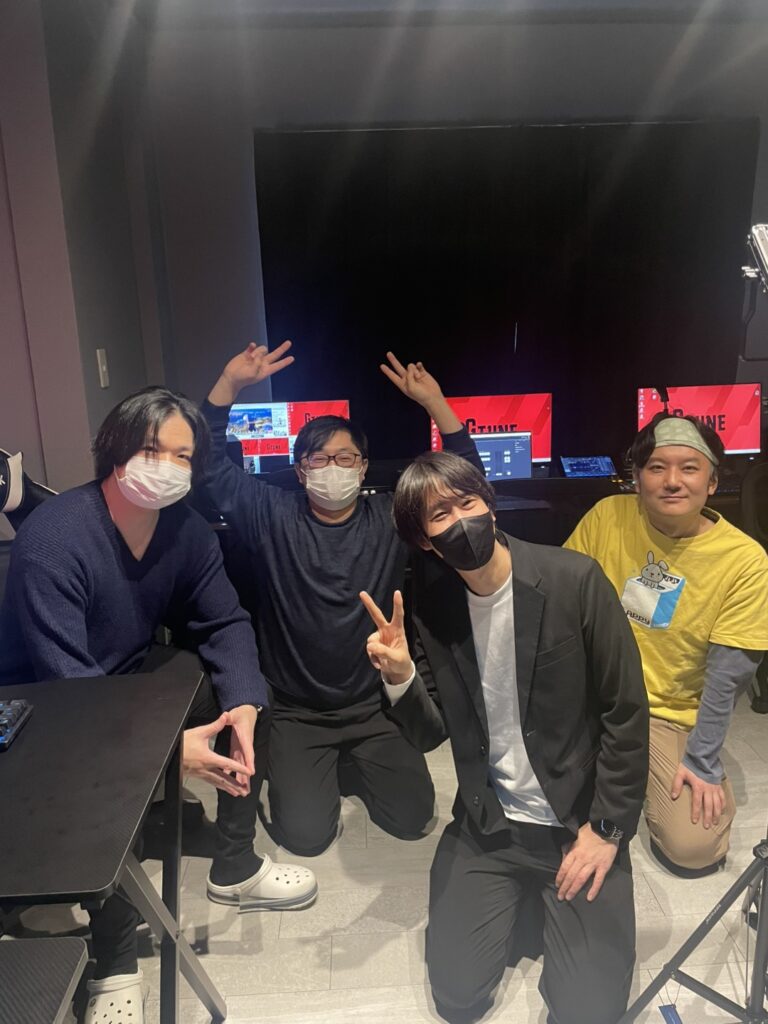 (左から選手コース コーチやすださん、イベントコースコーチいながきさん、管理者兼サビ管りゅういち、実況解説MCコースたかはしさん)